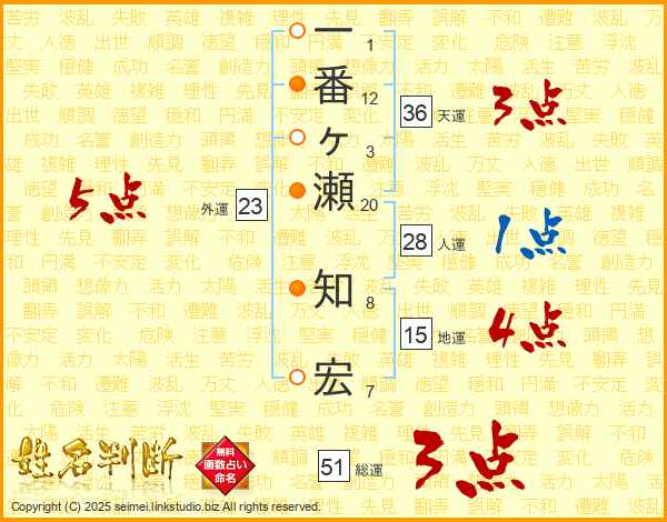 一番ヶ瀬知宏さんの総運は51画の3点!