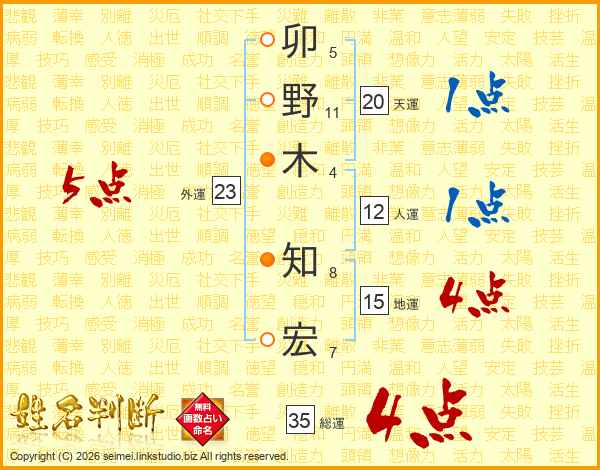 卯野木知宏さんの総運は35画の4点!