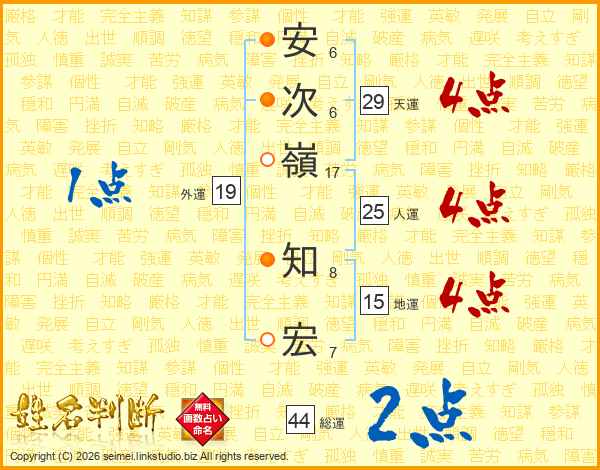 安次嶺知宏さんの総運は44画の2点!