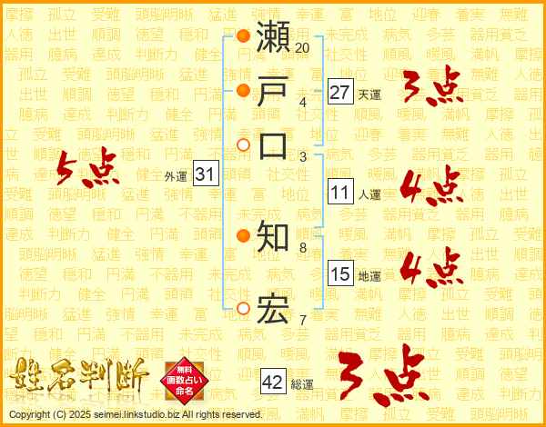 瀬(20画)戸(4画)口(3画) 知(8画)宏(7画)
