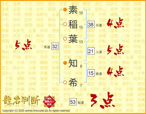 素(10画)稲(15画)葉(13画) 知(8画)希(7画)