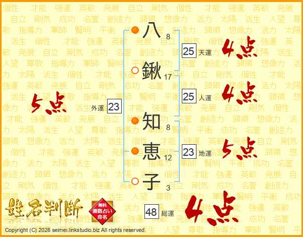 八(8画)鍬(17画) 知(8画)恵(12画)子(3画)
