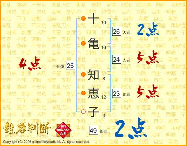 十(10画)亀(16画) 知(8画)恵(12画)子(3画)