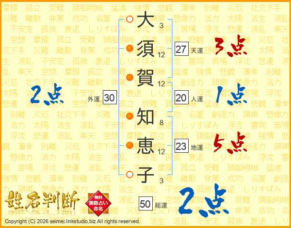 大(3画)須(12画)賀(12画) 知(8画)恵(12画)子(3画)