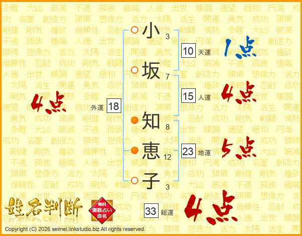 小(3画)坂(7画) 知(8画)恵(12画)子(3画)