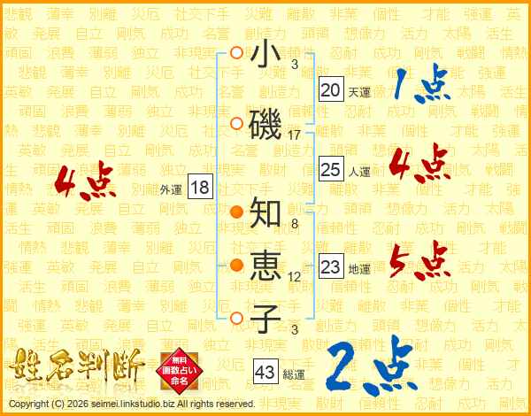 小(3画)磯(17画) 知(8画)恵(12画)子(3画)