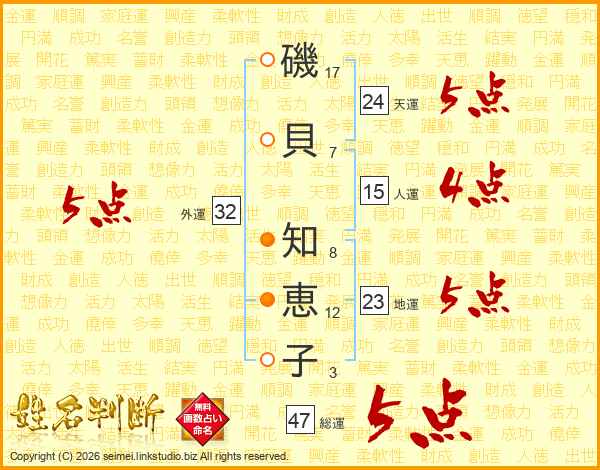 磯(17画)貝(7画) 知(8画)恵(12画)子(3画)