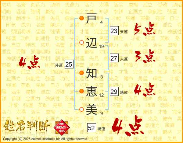 戸(4画)辺(19画) 知(8画)恵(12画)美(9画)