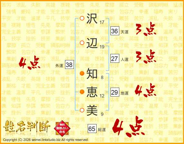 沢(17画)辺(19画) 知(8画)恵(12画)美(9画)