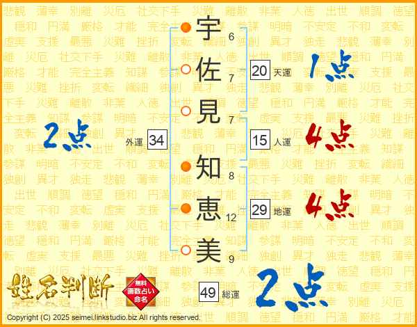 宇(6画)佐(7画)見(7画) 知(8画)恵(12画)美(9画)
