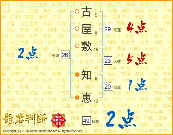 古(5画)屋(9画)敷(15画) 知(8画)恵(12画)