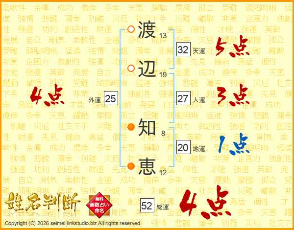 渡辺知恵さんの総運は52画の4点!