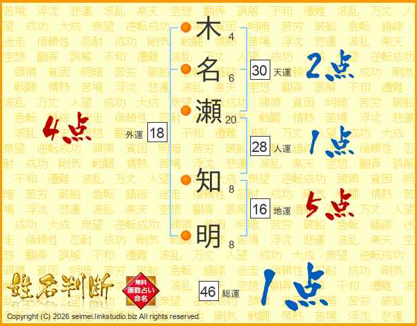 木(4画)名(6画)瀬(20画) 知(8画)明(8画)