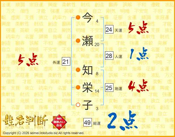 今(4画)瀬(20画) 知(8画)栄(14画)子(3画)
