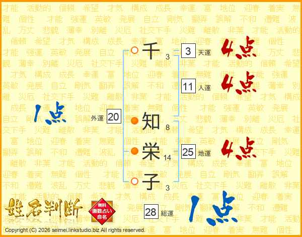 千(3画) 知(8画)栄(14画)子(3画)