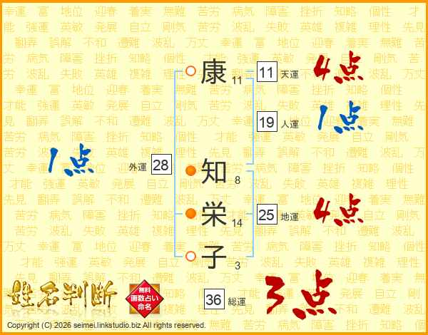 康(11画) 知(8画)栄(14画)子(3画)