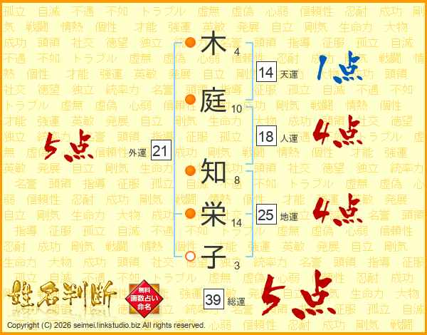 木庭知栄子さんの総運は39画の5点!