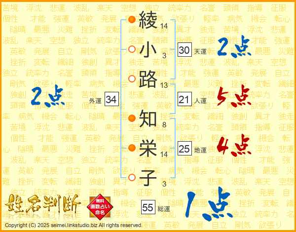 綾(14画)小(3画)路(13画) 知(8画)栄(14画)子(3画)