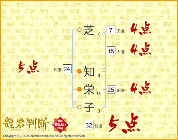 芝(7画) 知(8画)栄(14画)子(3画)