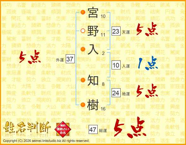 宮(10画)野(11画)入(2画) 知(8画)樹(16画)