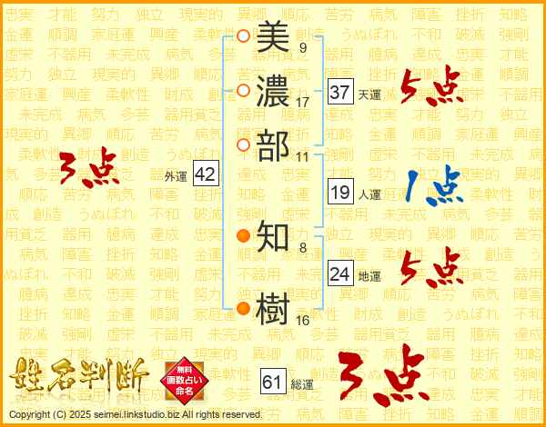 美(9画)濃(17画)部(11画) 知(8画)樹(16画)