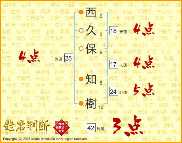 西(6画)久(3画)保(9画) 知(8画)樹(16画)