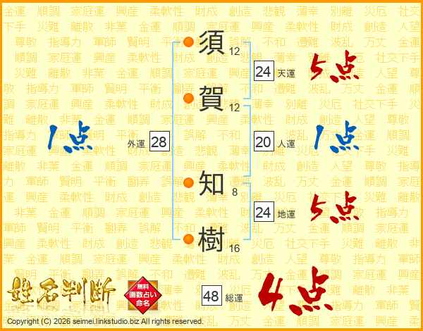 あなたの人生を表す1番重要な運勢です。生涯を通じて影響する総合運となり、主に50歳以降の晩年期に影響を及ぼします。苗字と名前の合計画数。