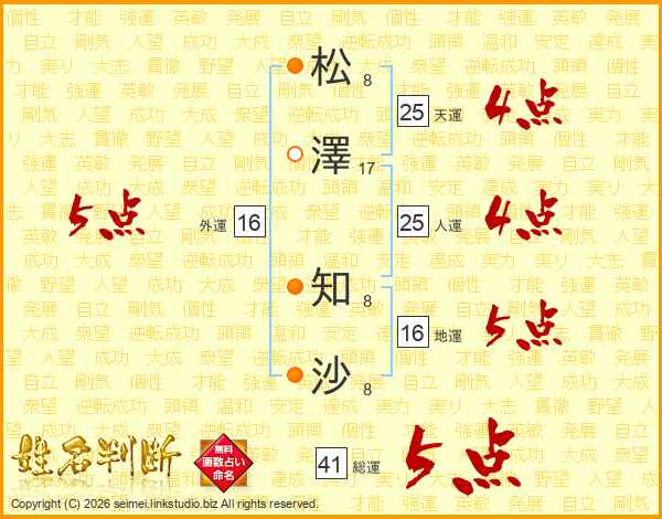 松(8画)澤(17画) 知(8画)沙(8画)