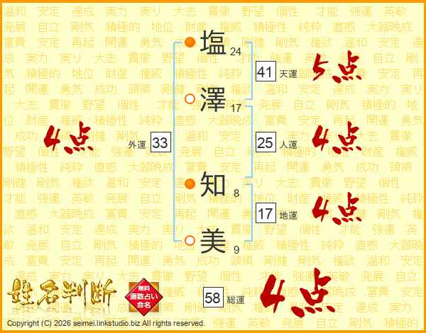 生活面を象徴する運勢です。外部から受ける影響力を表し、結婚運、家庭運や職場、環境への順応性を表します。総運から人運を引いた画数。姓や名が1文字の場合を除く。