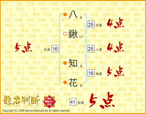 生活面を象徴する運勢です。外部から受ける影響力を表し、結婚運、家庭運や職場、環境への順応性を表します。総運から人運を引いた画数。姓や名が1文字の場合を除く。