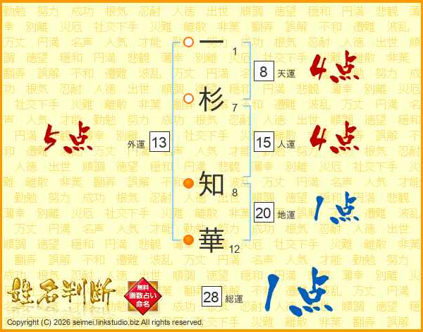 生活面を象徴する運勢です。外部から受ける影響力を表し、結婚運、家庭運や職場、環境への順応性を表します。総運から人運を引いた画数。姓や名が1文字の場合を除く。