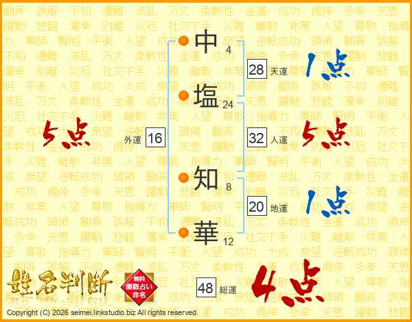 生活面を象徴する運勢です。外部から受ける影響力を表し、結婚運、家庭運や職場、環境への順応性を表します。総運から人運を引いた画数。姓や名が1文字の場合を除く。