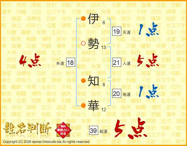 伊(6画)勢(13画) 知(8画)華(12画)