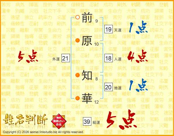 生活面を象徴する運勢です。外部から受ける影響力を表し、結婚運、家庭運や職場、環境への順応性を表します。総運から人運を引いた画数。姓や名が1文字の場合を除く。