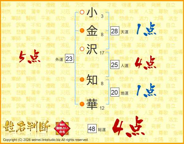 小(3画)金(8画)沢(17画) 知(8画)華(12画)