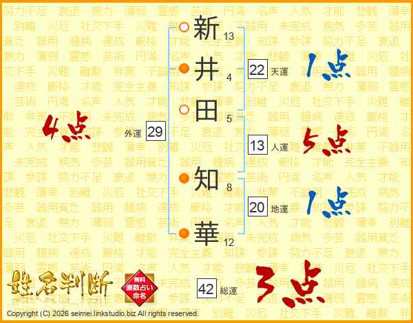 新(13画)井(4画)田(5画) 知(8画)華(12画)