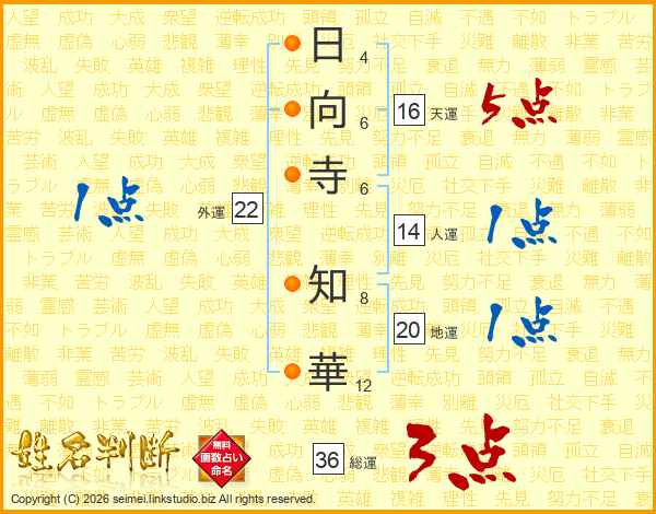 日(4画)向(6画)寺(6画) 知(8画)華(12画)