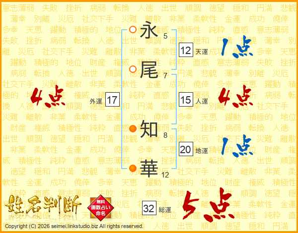 生活面を象徴する運勢です。外部から受ける影響力を表し、結婚運、家庭運や職場、環境への順応性を表します。総運から人運を引いた画数。姓や名が1文字の場合を除く。