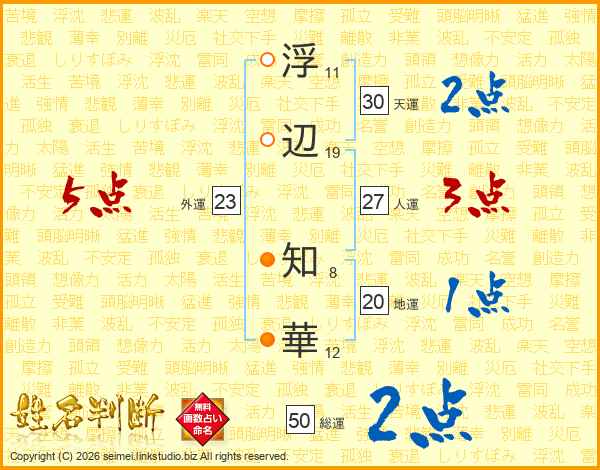 生活面を象徴する運勢です。外部から受ける影響力を表し、結婚運、家庭運や職場、環境への順応性を表します。総運から人運を引いた画数。姓や名が1文字の場合を除く。