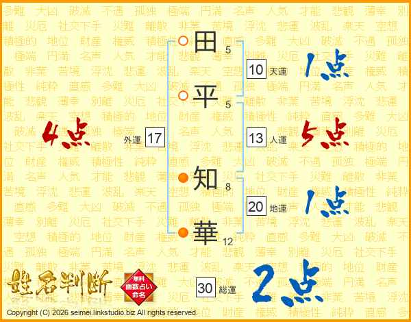 田(5画)平(5画) 知(8画)華(12画)