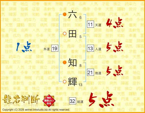 六田知輝さんの総運は32画の5点!