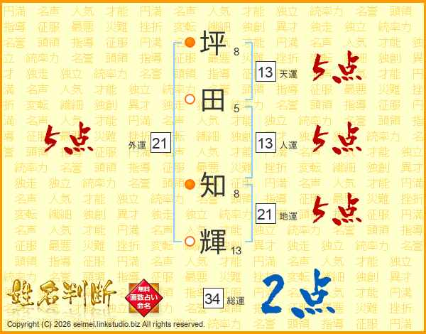 坪田知輝さんの人運は13画の5点!
