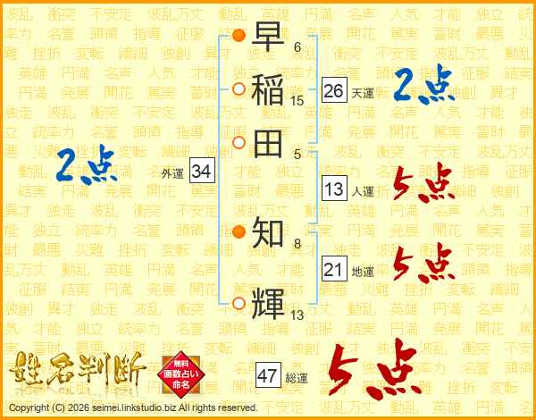 早(6画)稲(15画)田(5画) 知(8画)輝(13画)