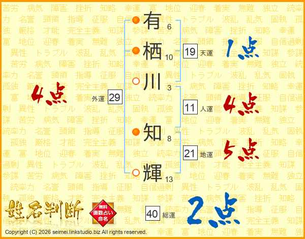 有(6画)栖(10画)川(3画) 知(8画)輝(13画)