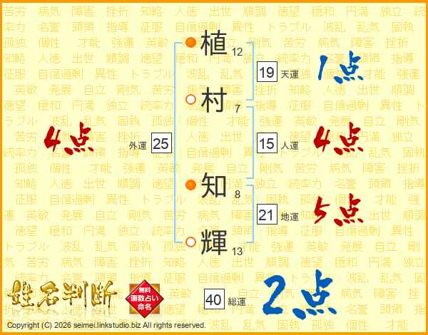 植(12画)村(7画) 知(8画)輝(13画)
