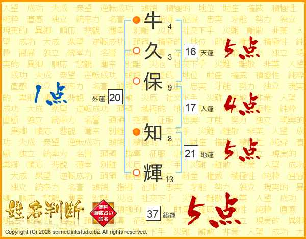 牛(4画)久(3画)保(9画) 知(8画)輝(13画)