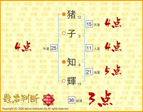 猪(12画)子(3画) 知(8画)輝(13画)