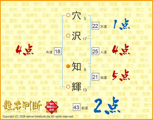 穴(5画)沢(17画) 知(8画)輝(13画)