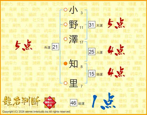 小(3画)野(11画)澤(17画) 知(8画)里(7画)
