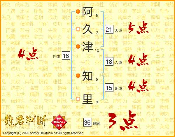 阿(8画)久(3画)津(10画) 知(8画)里(7画)